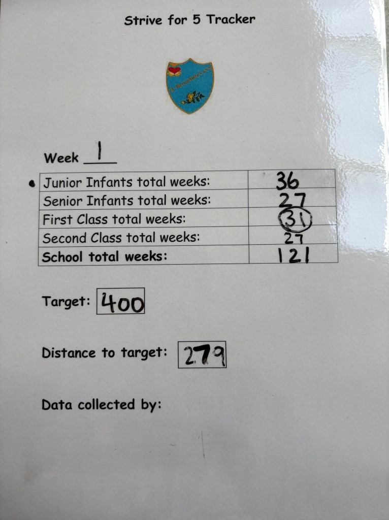 On Friday October 3rd, 3 helpers from 2nd class; Braxton, Kobi & Hunter along with Ms Corbet went around the school to check the calendars and calculate how many weeks we have achieved. We are delighted to say 121 children in the school were in for the full week so we have reached 121 weeks already. Over the next 3 weeks we have to get 279 more weeks in order to get our Halloween disco. Keep up the good work everyone!!